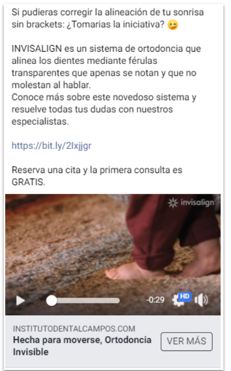 En cuanto a Facebook, la imagen y el copy que utilices debe ser llamativa. La imagen debe estar acorde al tratamiento, pero no deben ser imágenes de instrumentos o procedimientos quirúrgicos. Trata de usar imagen con pacientes o del equipo de la clínica.